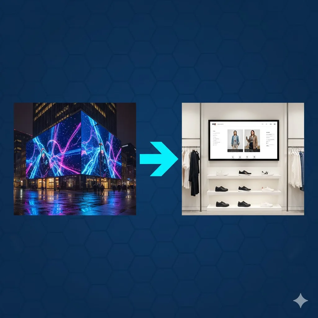 ガラス越しの透明LEDビジョンを使えば、店舗内の雰囲気を損なわずに映像演出が可能。ファッション・カフェ・美容室などで導入が増えています。