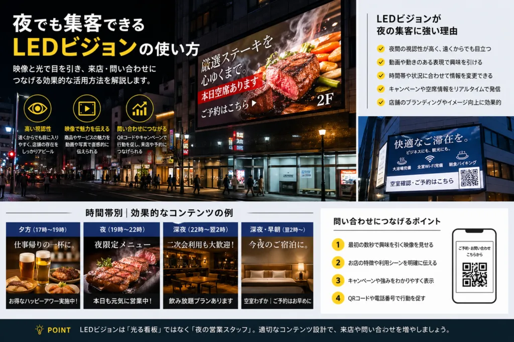 夜でも集客できるLEDビジョンの使い方|店舗の存在感を高め、来店・問い合わせにつなげる実践方法