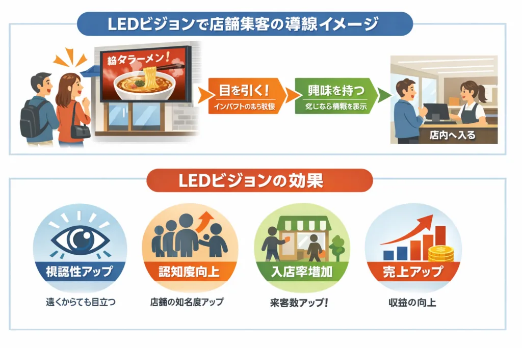店舗集客を大きく変えるLEDビジョン活用方法を解説。デジタルサイネージの効果、売上につながる設置場所、映像コンテンツの作り方、成功事例まで詳しく紹介。店舗の集客力を高めたい方必見のLEDビジョン完全ガイドです。