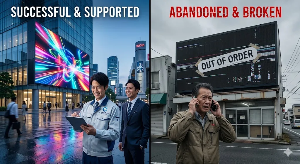 LEDモニターやLEDディスプレイは、精密機器です。設置して終わりではなく、熱対策や通信設定など、専門的な知識が不可欠。知識がないまま販売した業者は、トラブルが発生した際に対処できず、パニックになって「逃げる(連絡を断つ)」という選択肢をとってしまいます。