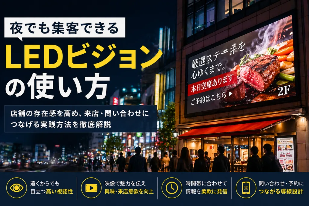 1. なぜ“設置だけ”では意味がないのか LEDビジョンは高額な設備投資でありながら、「とりあえず映像を流しているだけ」という状態に陥るケースが非常に多いです。 この状態の問題は大きく3つあります。 ① 情報が“流れているだけ”で伝わっていない 通行人や... -
